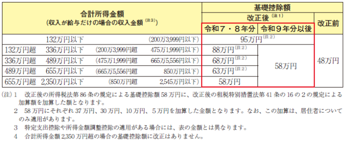 令和7年度税制改正により、基礎控除および給与所得控除について、以下のように改正されました。