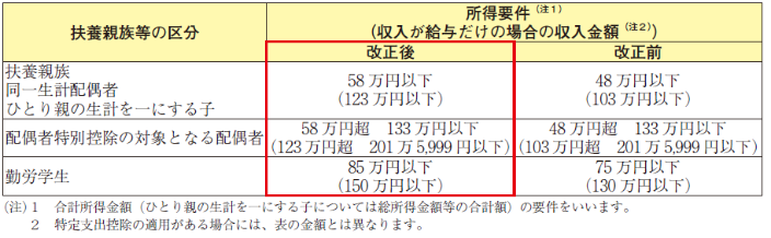 今回の基礎控除の改正に伴い、扶養控除等の対象となる扶養親族等の所得要件が改正されました。