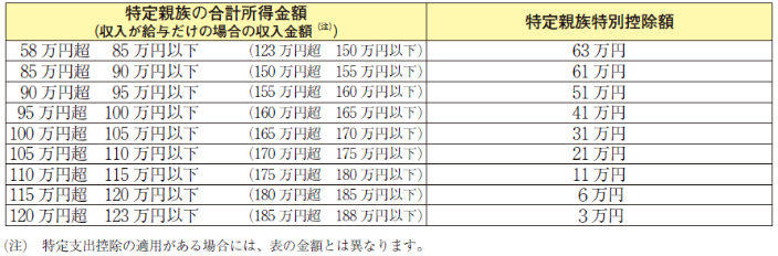 その特定親族の合計所得金額に応じて次の金額を控除する特定親族特別控除が創設されました。